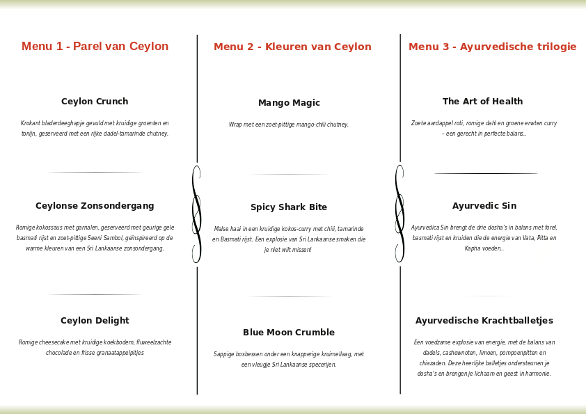 Op deze pagina vind je ook een voorbeeldmenu om een indruk te krijgen van wat we kunnen bereiden. Ons aanbod varieert per seizoen en beschikbaarheid van verse ingrediënten, dus elke maaltijd is uniek.